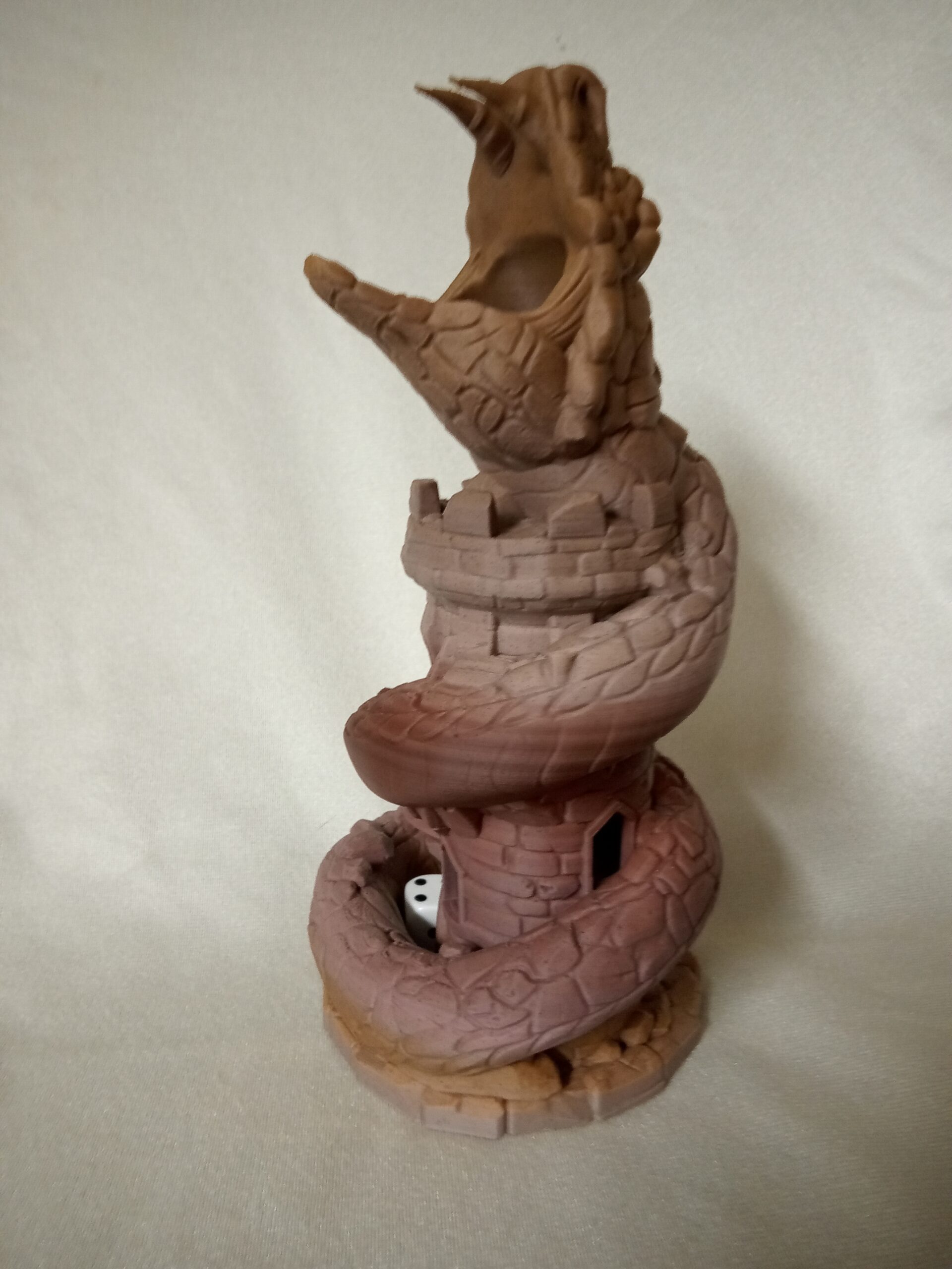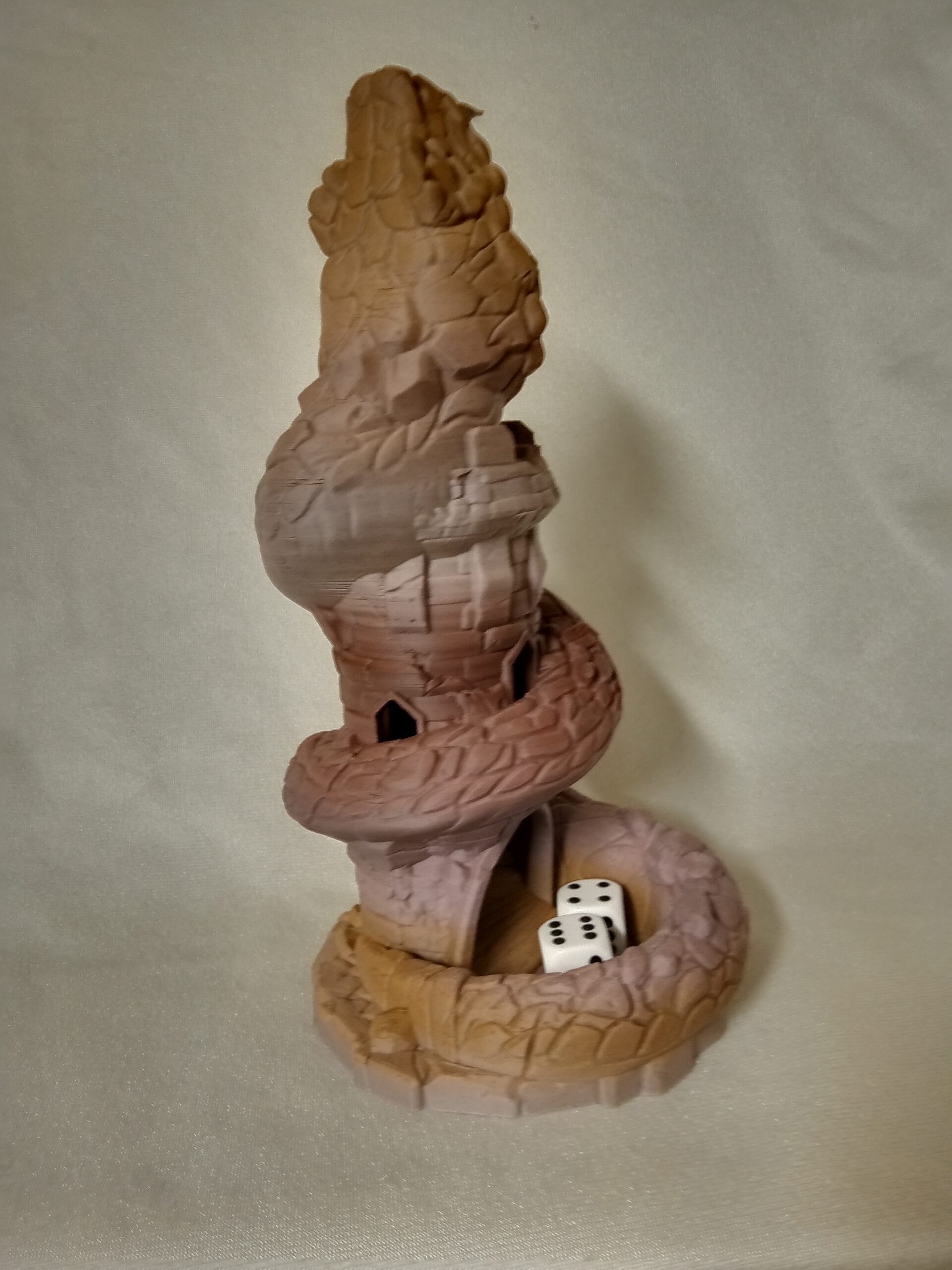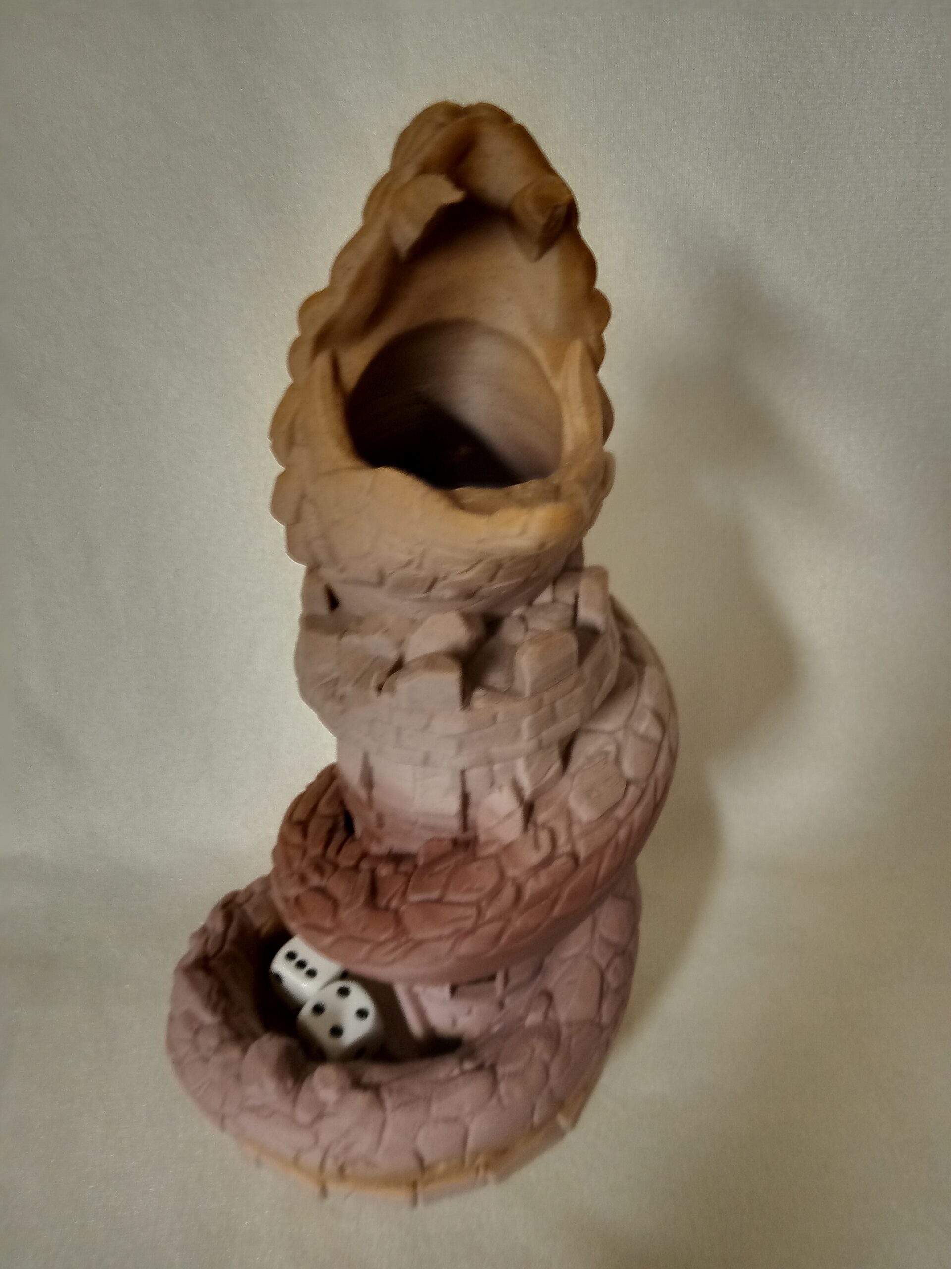 Basilisk Dice Tower printed with sedmentary rock color filament. Have fun using a dice tower for games instead of just throwing the dice.