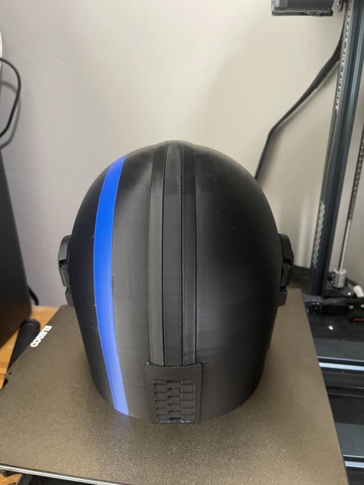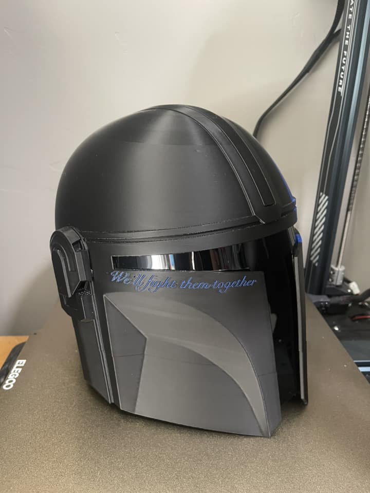 3D printed Mandalorian helmet featuring a thin blue line. This particular helmet came has the custom text “We’ll fight them together” on the the side. This can be taken off, or other custom text can be addded. This helmet is sized approximately the same as a medium to large motorcycle helmet. It includes a tinted visor.