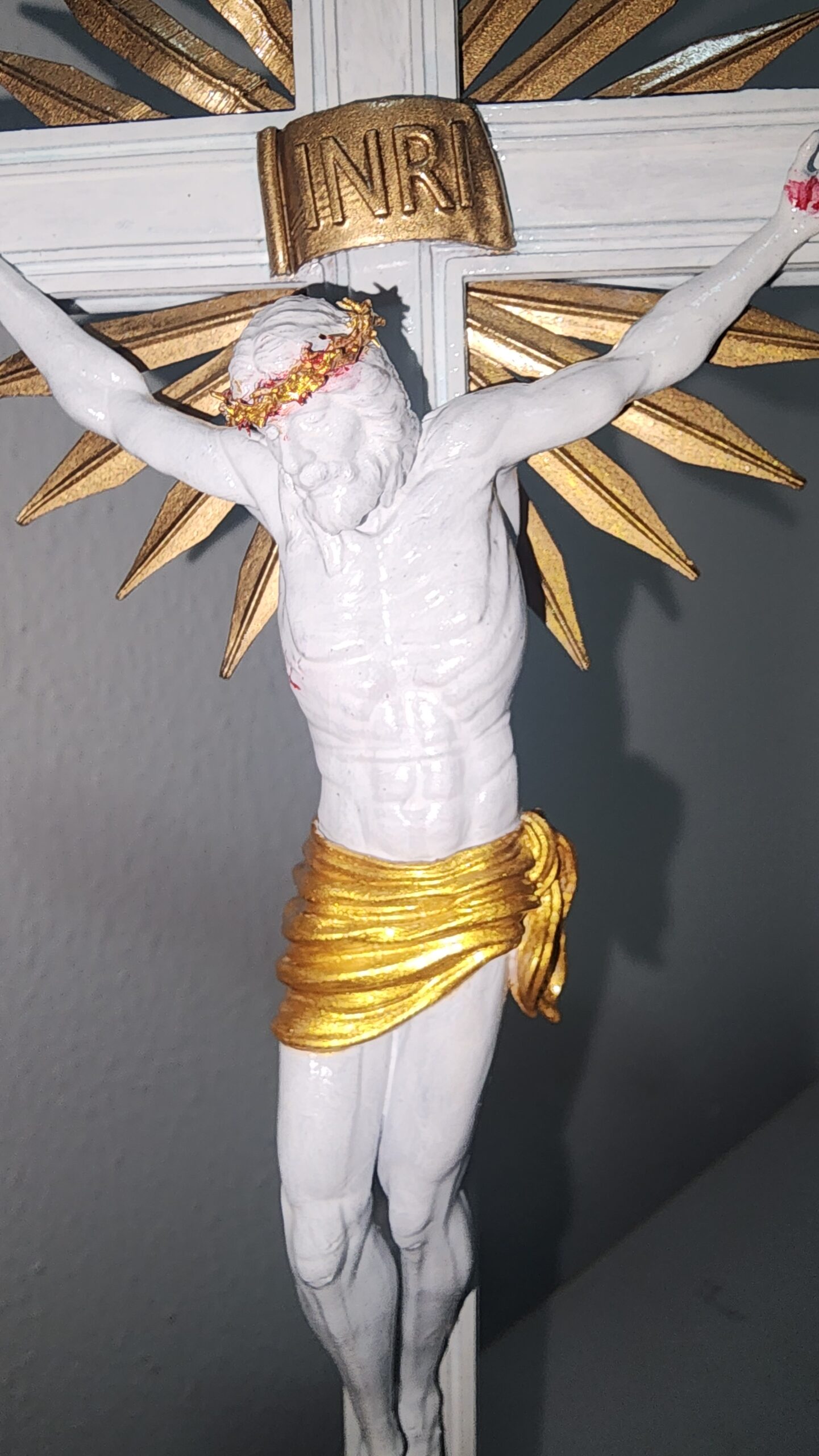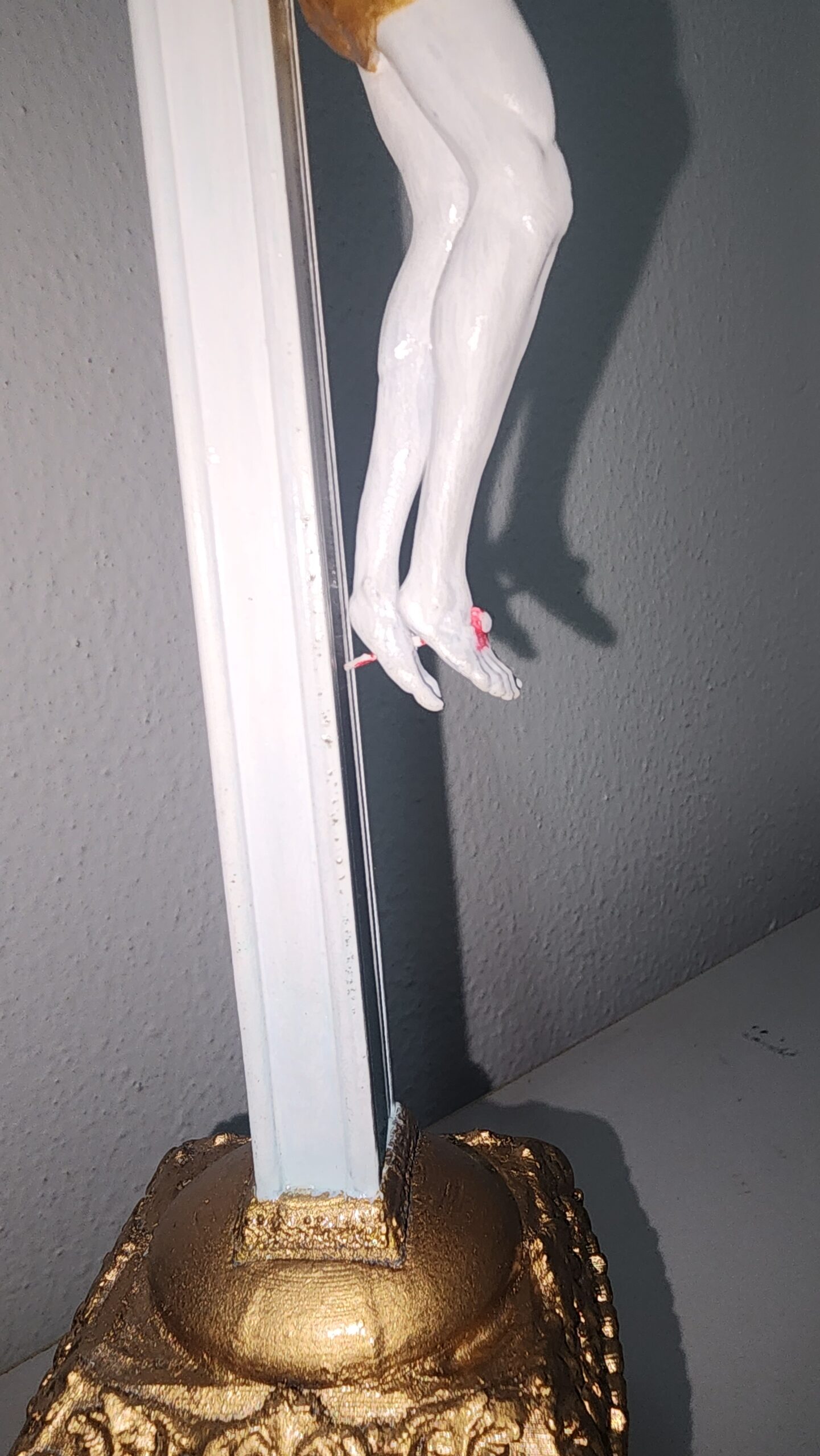 A base é impressa em filamento com madeira e a peça é pintada à mão em branco e dourado, com detalhes em vermelho sangue que realçam a expressão e o sacrifício de Jesus. Cada detalhe foi cuidadosamente trabalhado para proporcionar uma aparência realista e impactante.