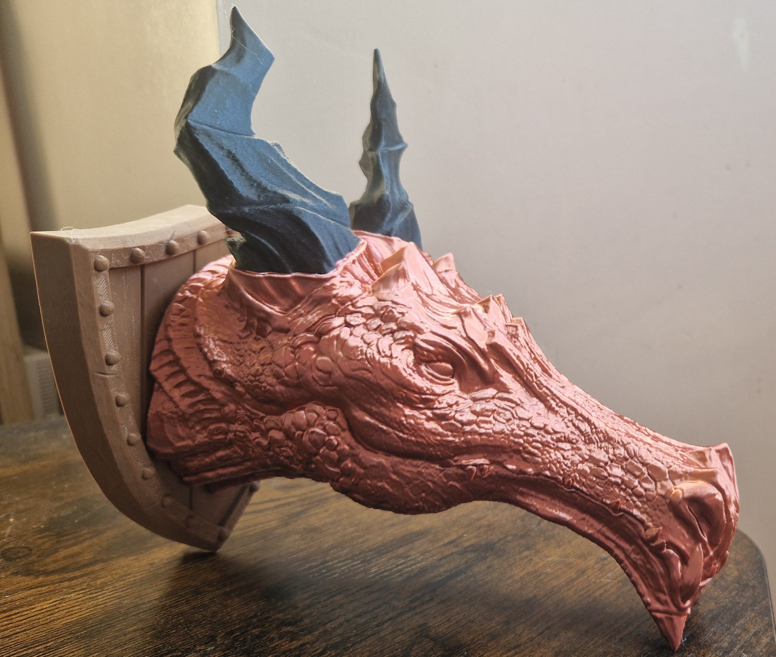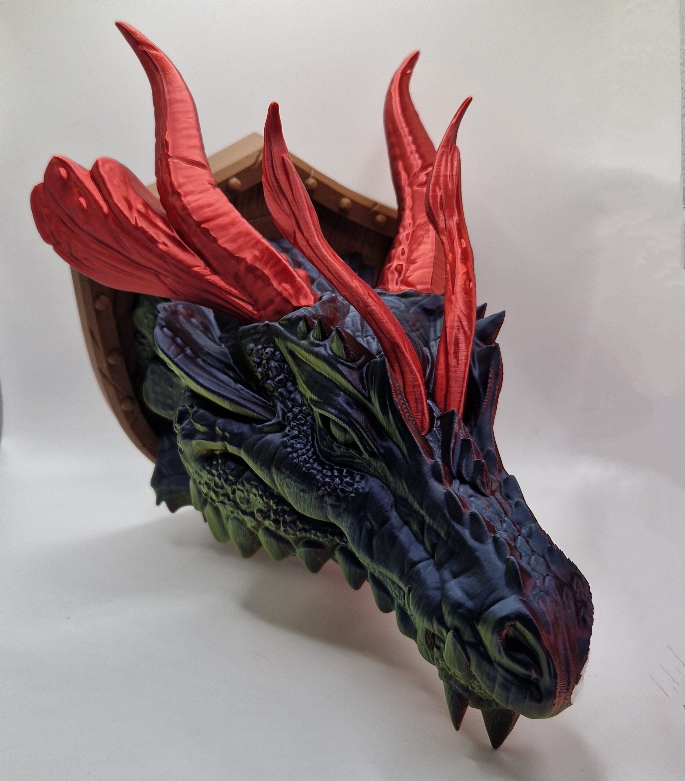 Introducing our stunning 3D-printed dragon head trophy, perfect for mounting on any wall as a statement piece. The intricate details of the design make it stand out as a unique addition to any room, and the high-quality materials ensure a durable and long-lasting product. This dragon head trophy is a great addition to any fandom-themed collection or fantasy-inspired decor. It also makes for a fantastic gift for any lover of dragons and mythical creatures. Bring the magic of the world of dragons into your home with this eye-catching trophy.