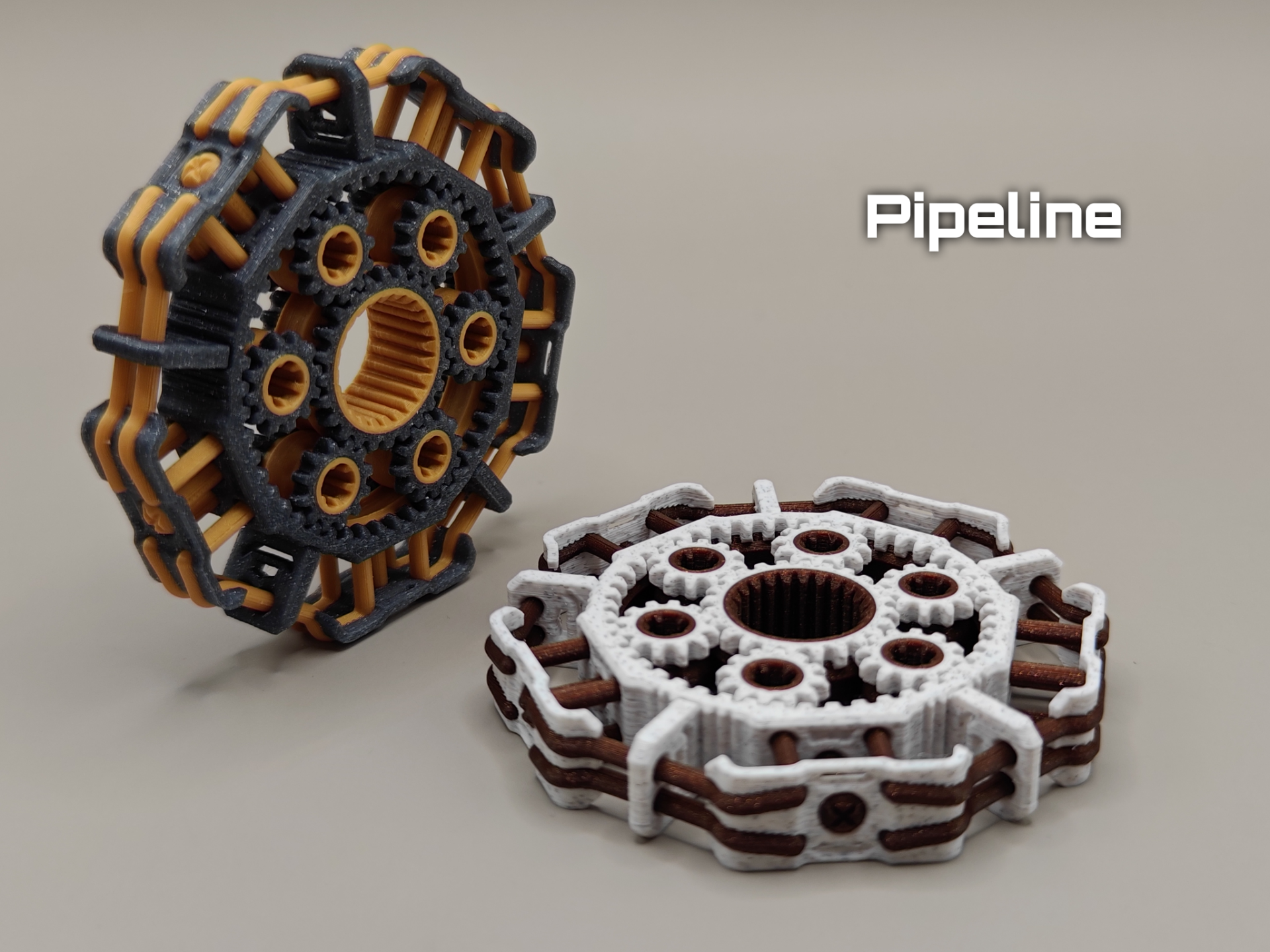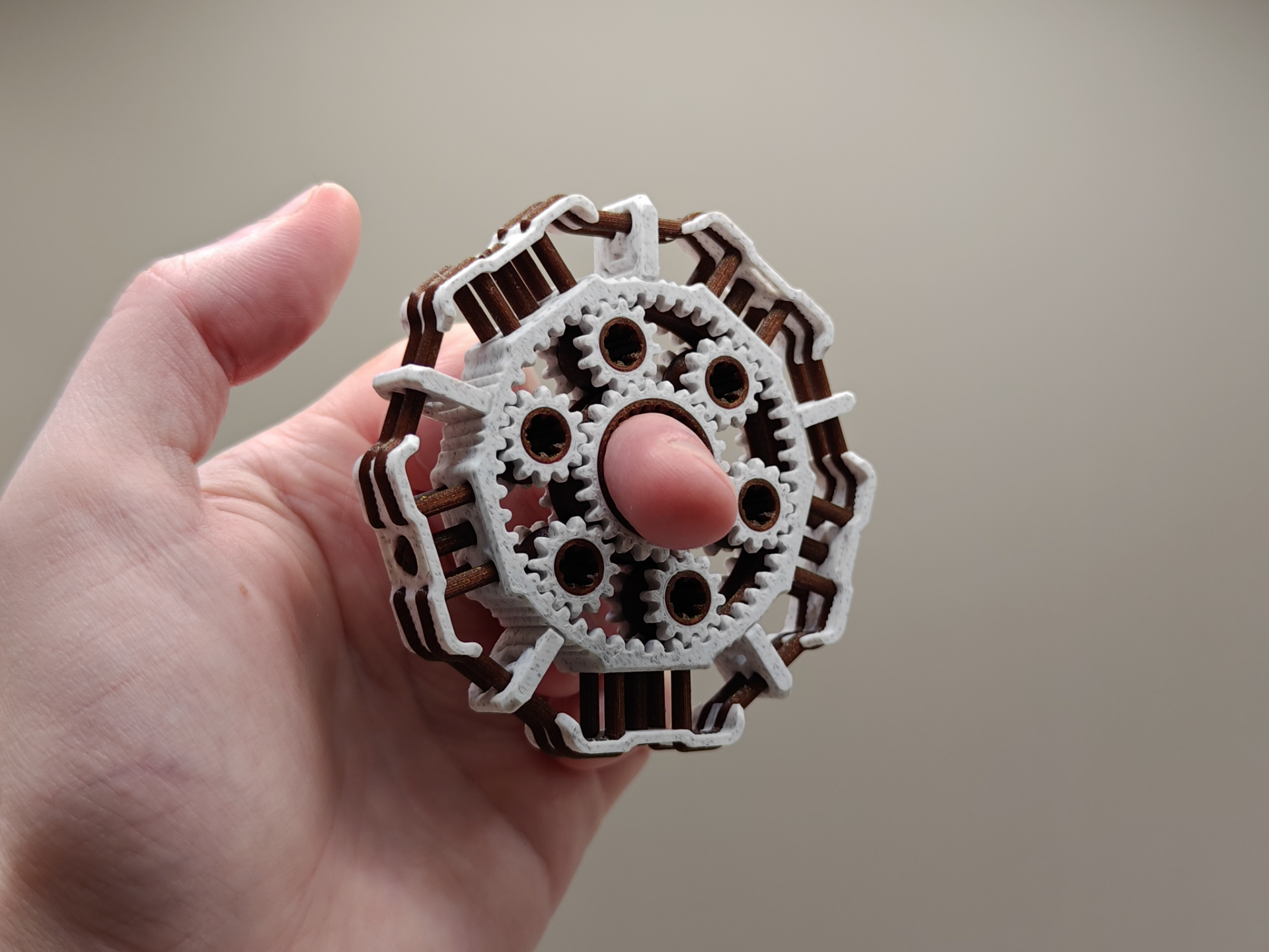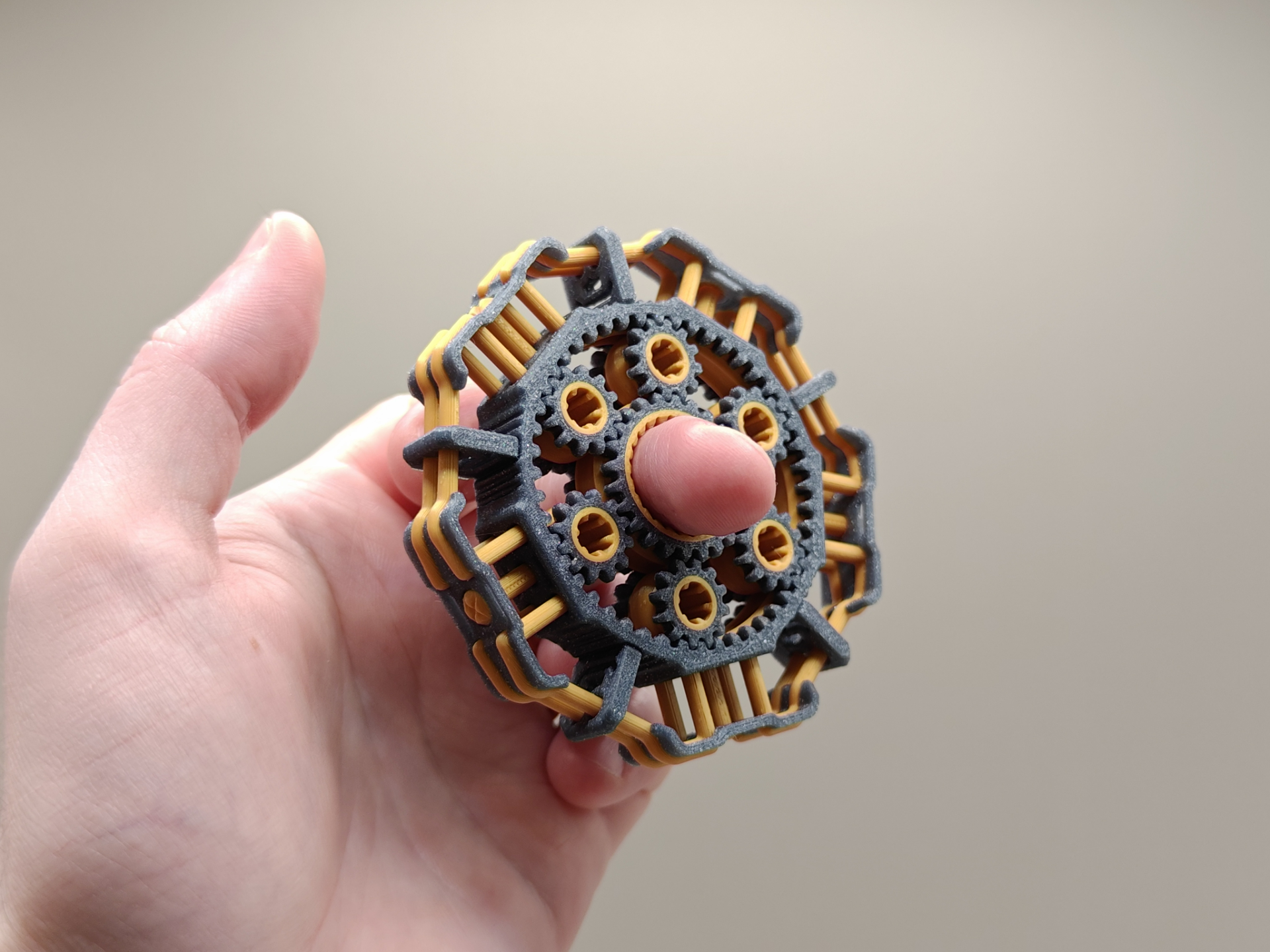Uma engrenagem planetária de alta resistência em formato de spinner antiestresse. Conta com  6 engrenagens circulares.