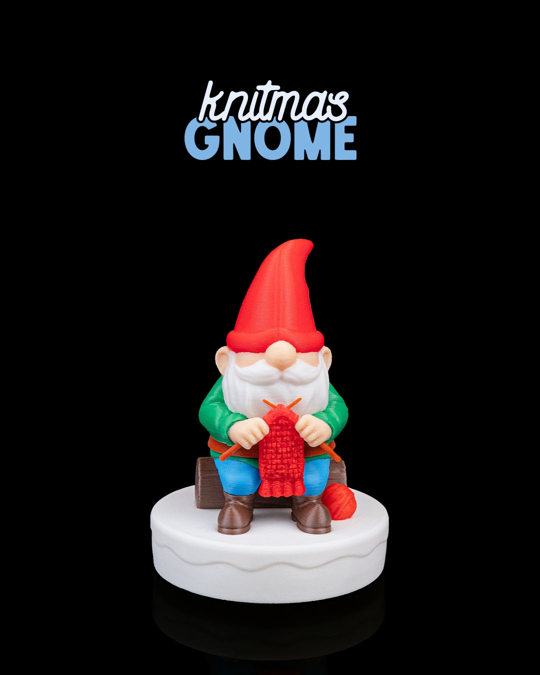No centro, há uma estatueta de um gnomo de jardim sentado em um pequeno tronco de árvore. Ele veste um chapéu pontudo vermelho, túnica verde, calças azuis e botas marrons. O gnomo tem uma longa barba branca e está tricotando algo em vermelho, segurando duas agulhas de tricô. Um novelo de lã vermelha está no chão, à sua direita.