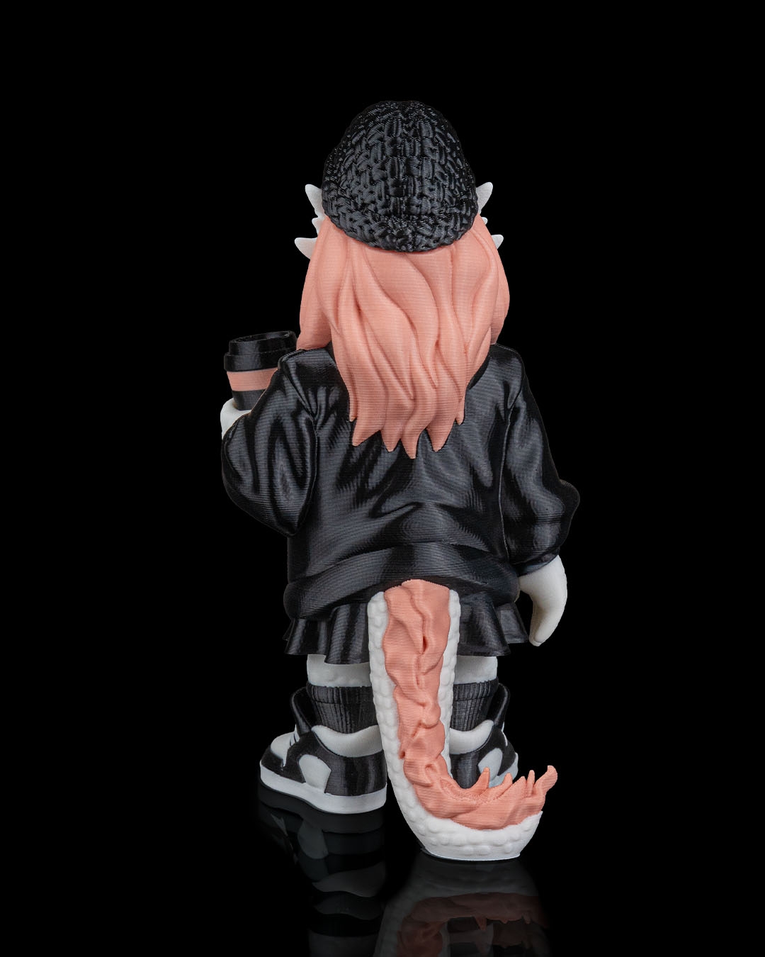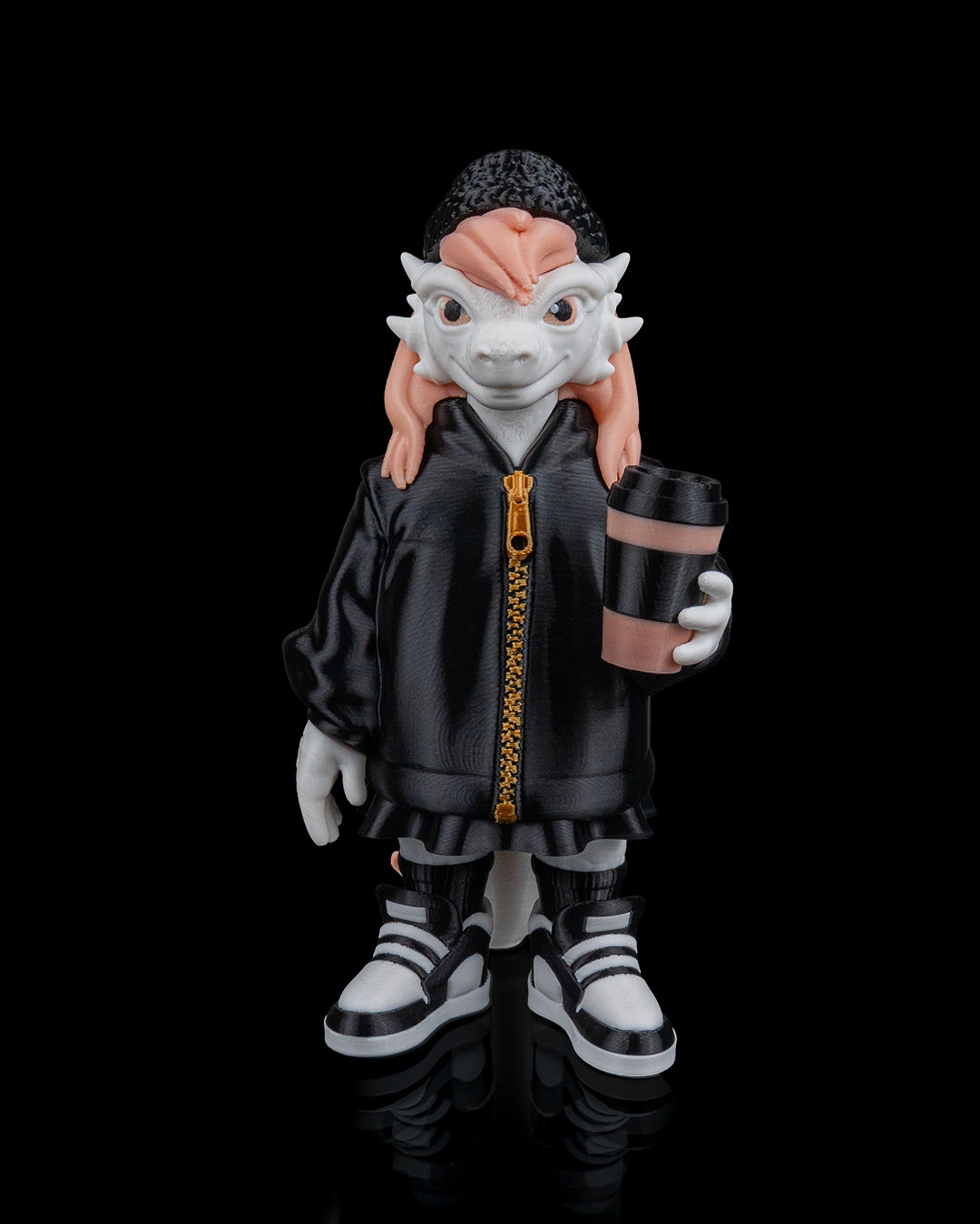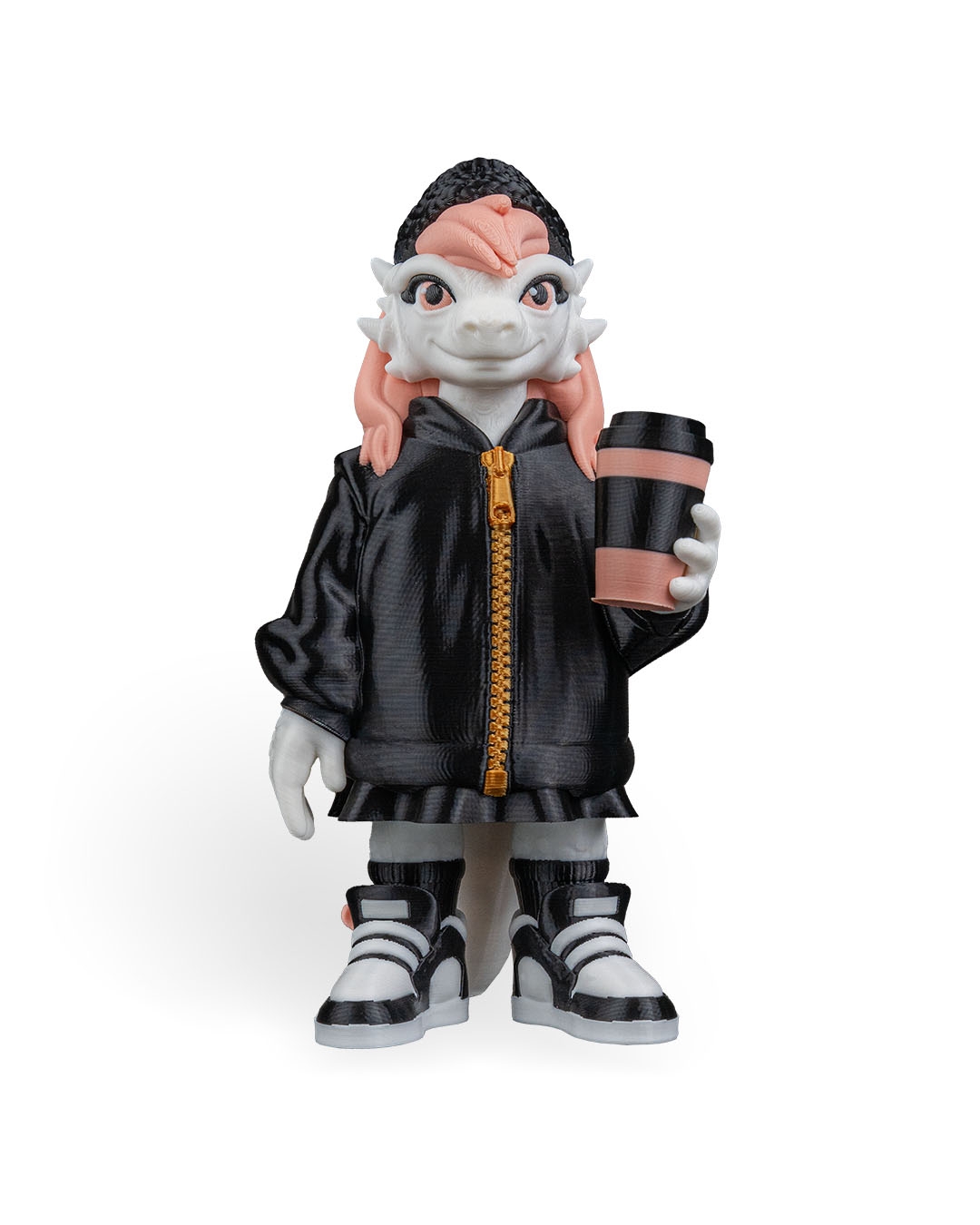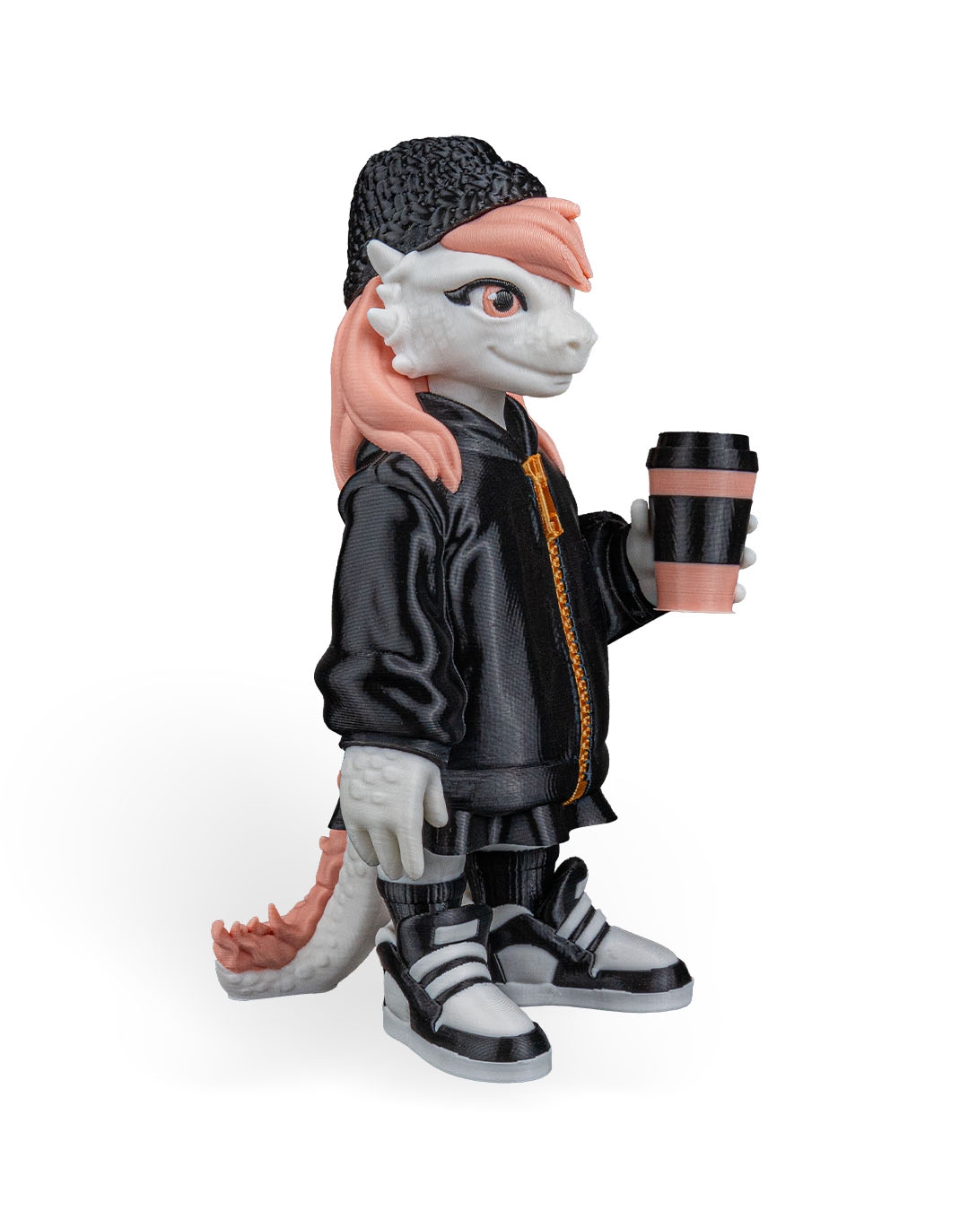 Dressed in a black jacket with a contrasting zipper, paired with sneakers and a textured beanie, this dragon has a streetwear‑inspired look. The pastel hair adds a pop of color and personality, balancing the darker outfit for a visually appealing design.