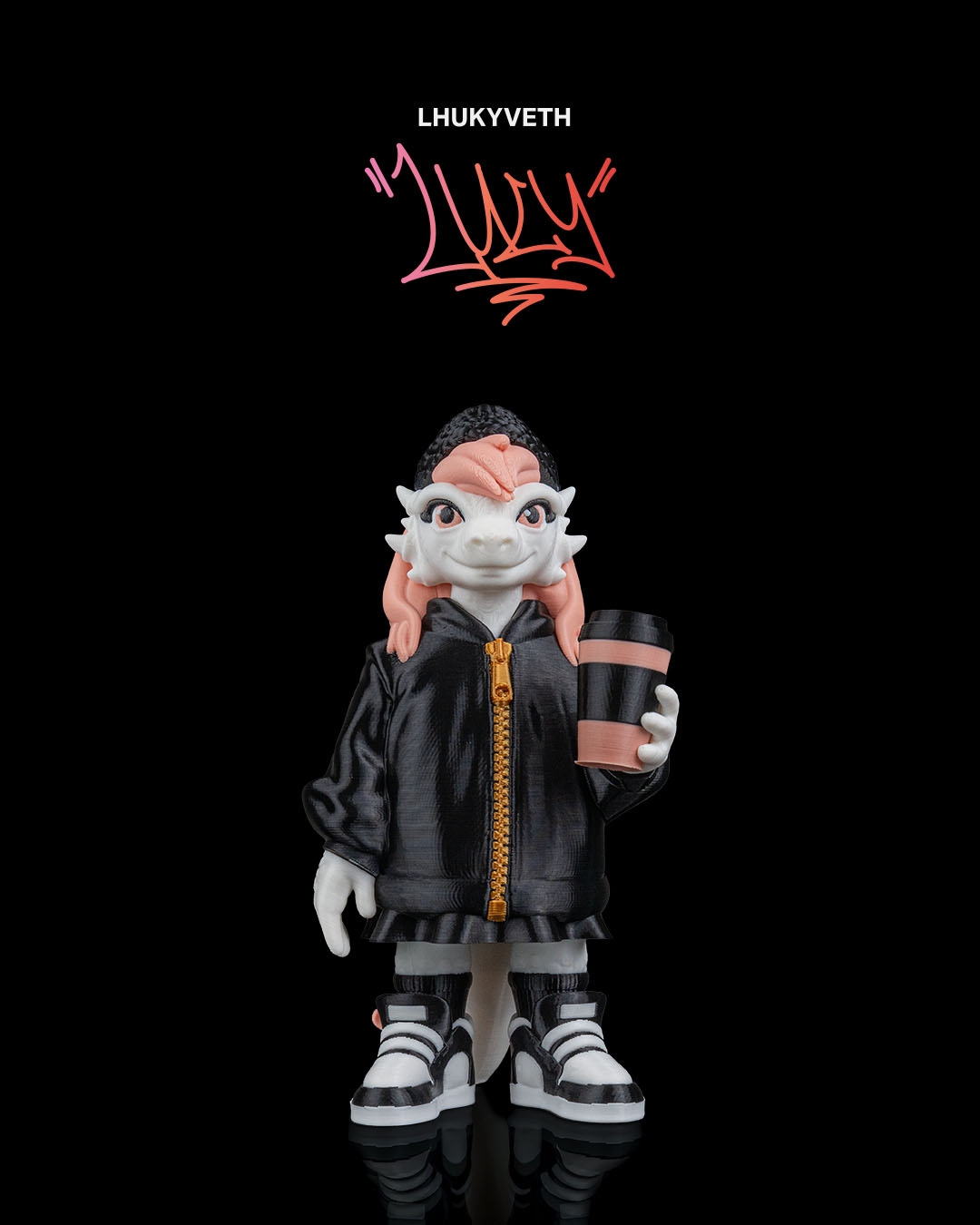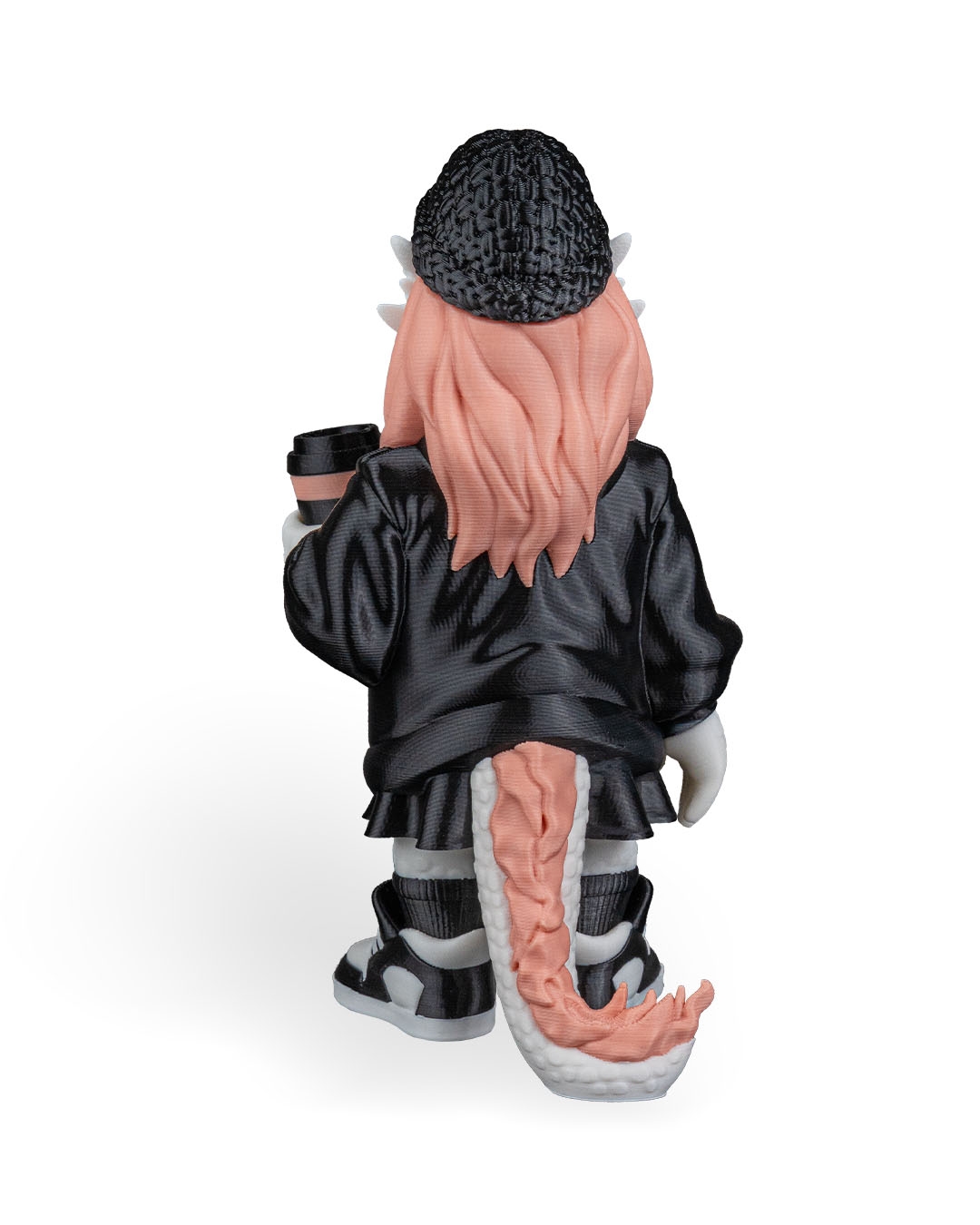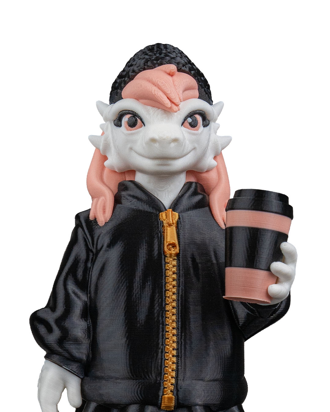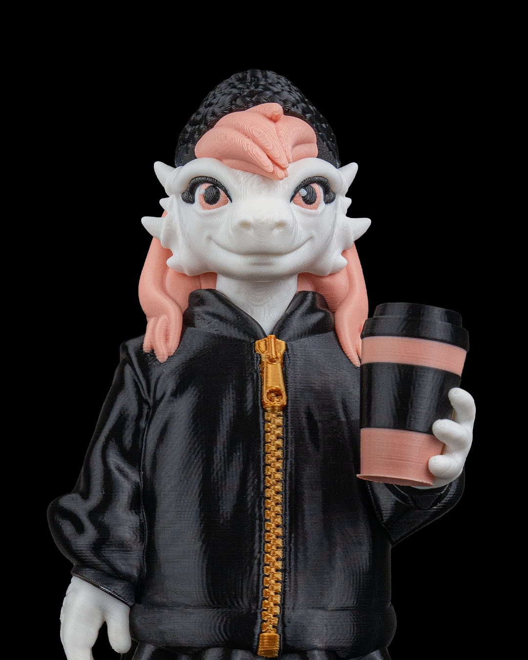 Dressed in a black jacket with a contrasting zipper, paired with sneakers and a textured beanie, this dragon has a streetwear‑inspired look. The pastel hair adds a pop of color and personality, balancing the darker outfit for a visually appealing design.