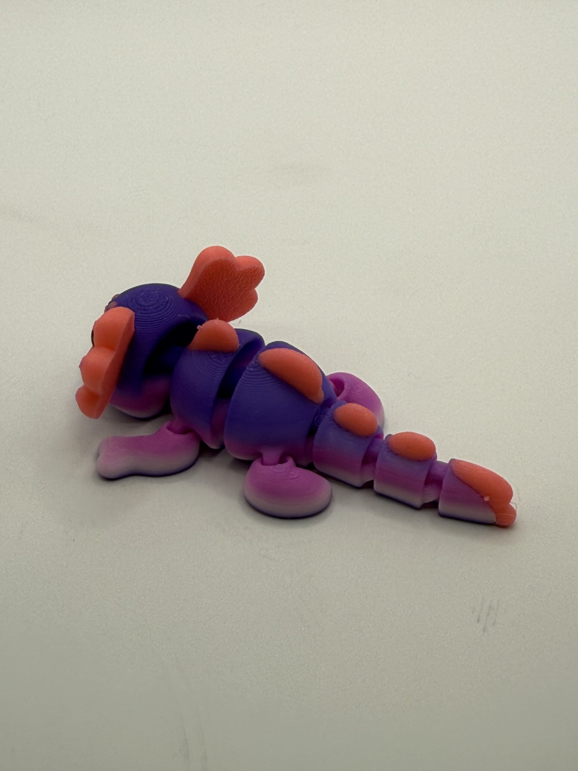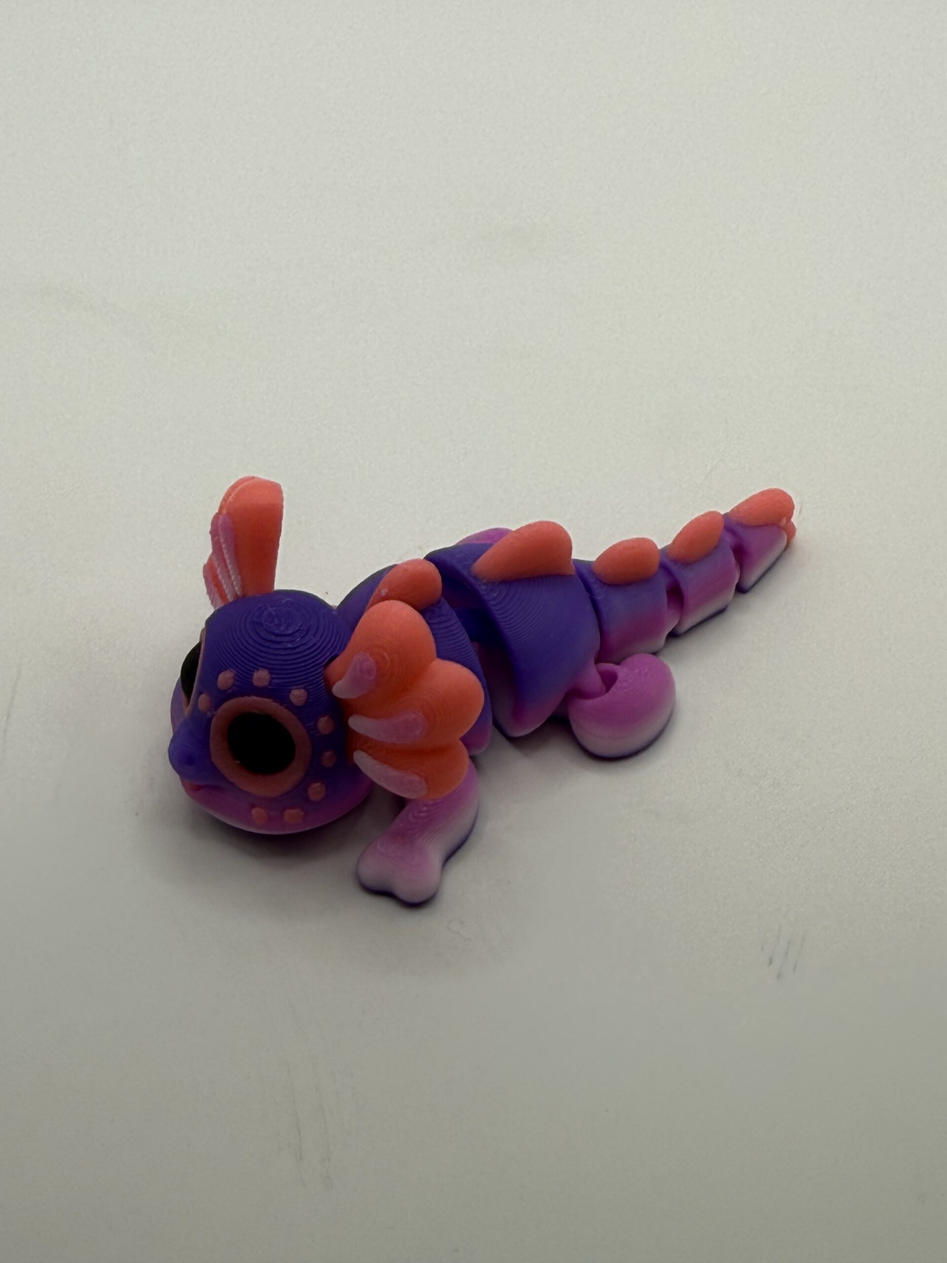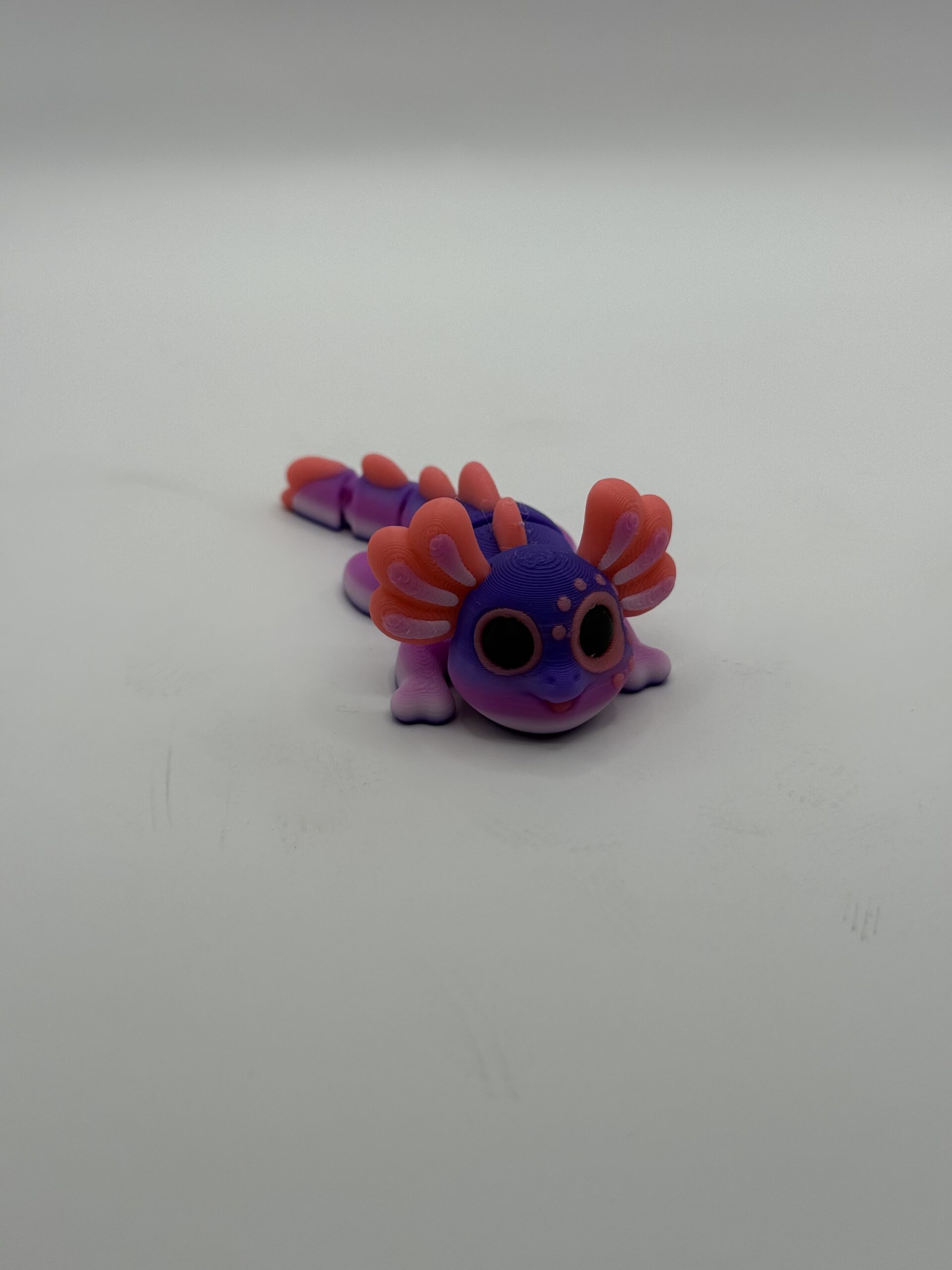 Mini Axolotl with unknown designer. This is printed with a filament that changes color as it prints, so slight variations in your colors are possible.