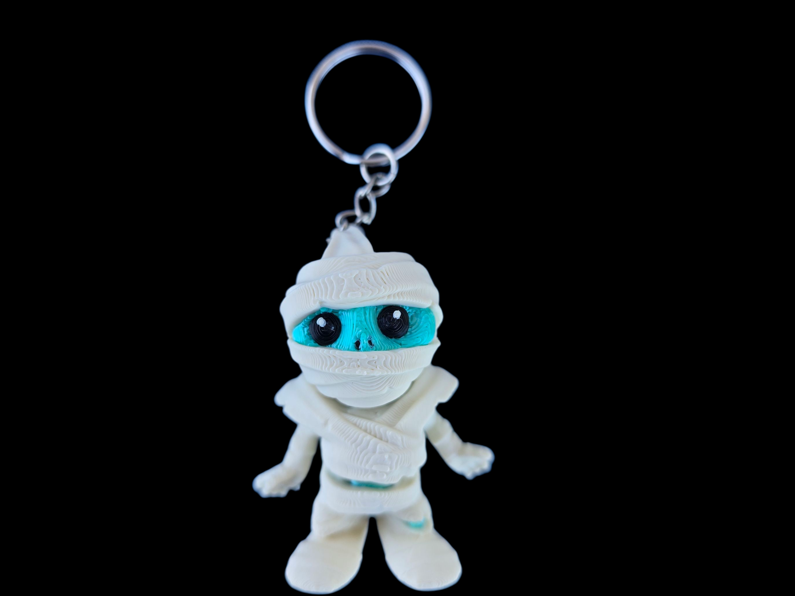 A tiny, whimsical guardian wrapped in textured white bandages with a bright turquoise face and oversized round eyes that read as instantly friendly. The compact, stylized silhouette and short limbs give it a collectible, toy-like presence that feels both playful and intentionally designed. A short metal chain and loop anchor it to keys, backpacks, or zipper pulls for everyday charm.