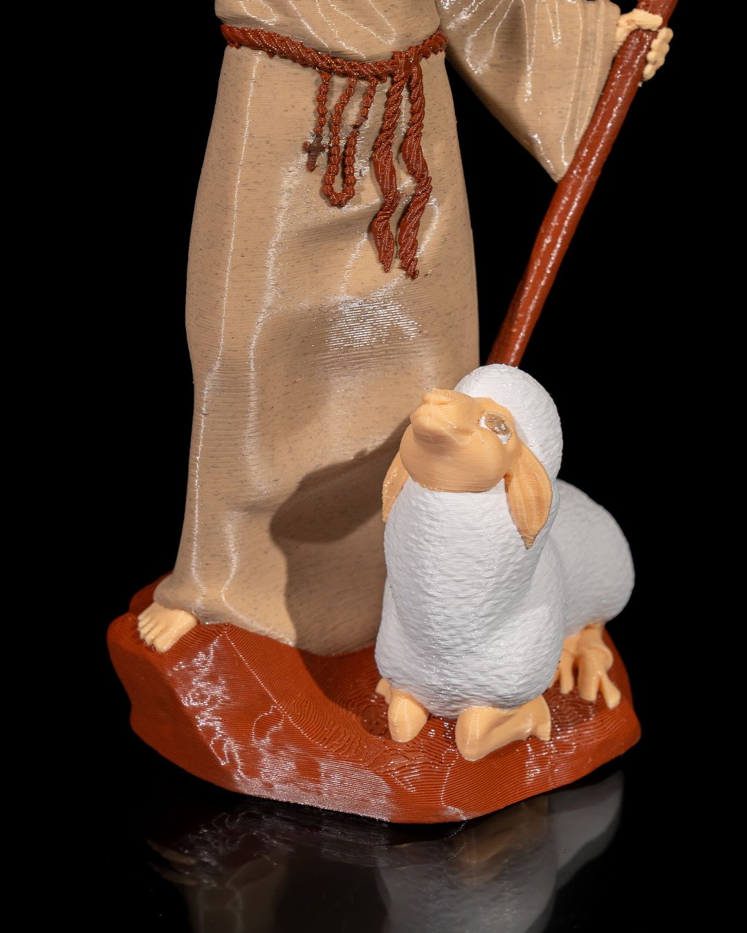 Detalhes: Figura segurando um pássaro branco e com um cordeiro aos pés.