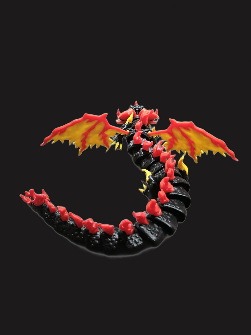 Unleash the heat with this stunning 3D Printed Fire Dragon, a bold and blazing creature brought to life in a powerful mix of black, red, and yellow. With an articulated body and flexible joints, this dragon slithers, curls, and poses like it’s alive—ready to soar across your desk or guard your treasure hoard.