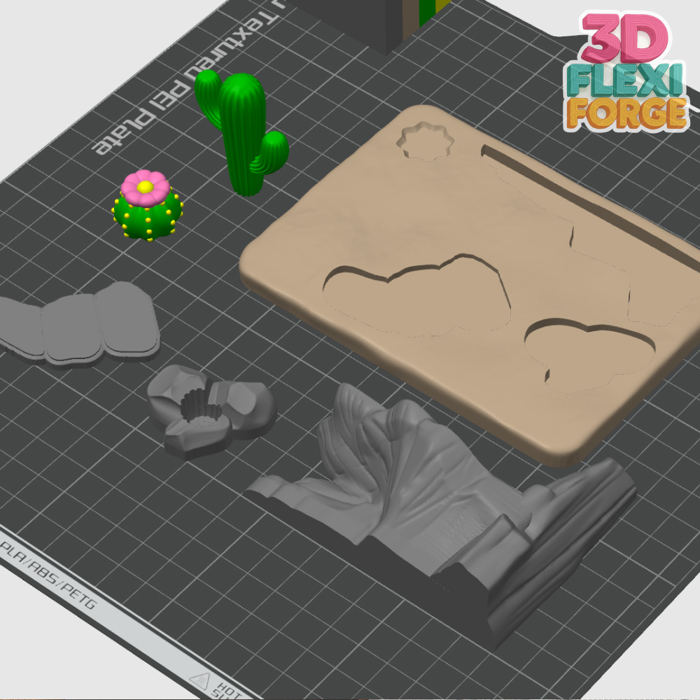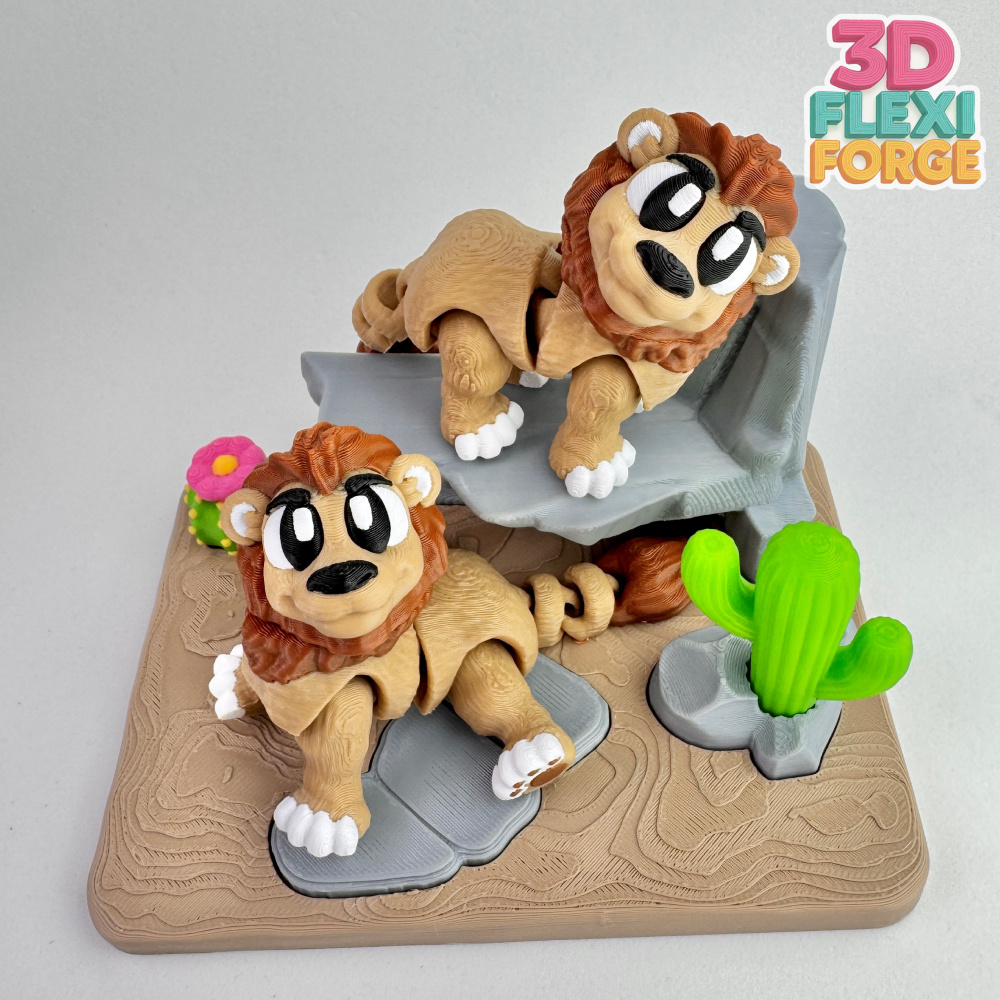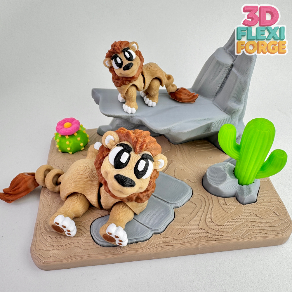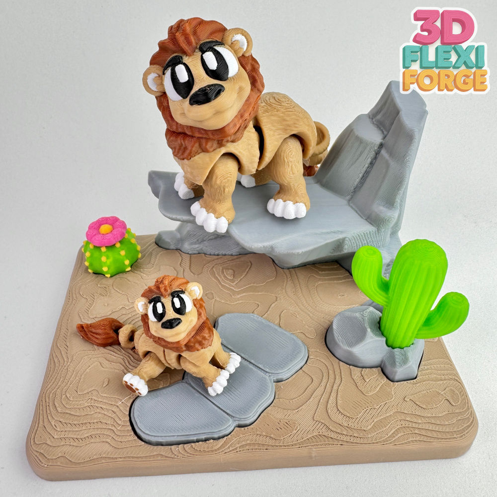 This new design features a cute flexi lion resting in a stylized semi-desert environment