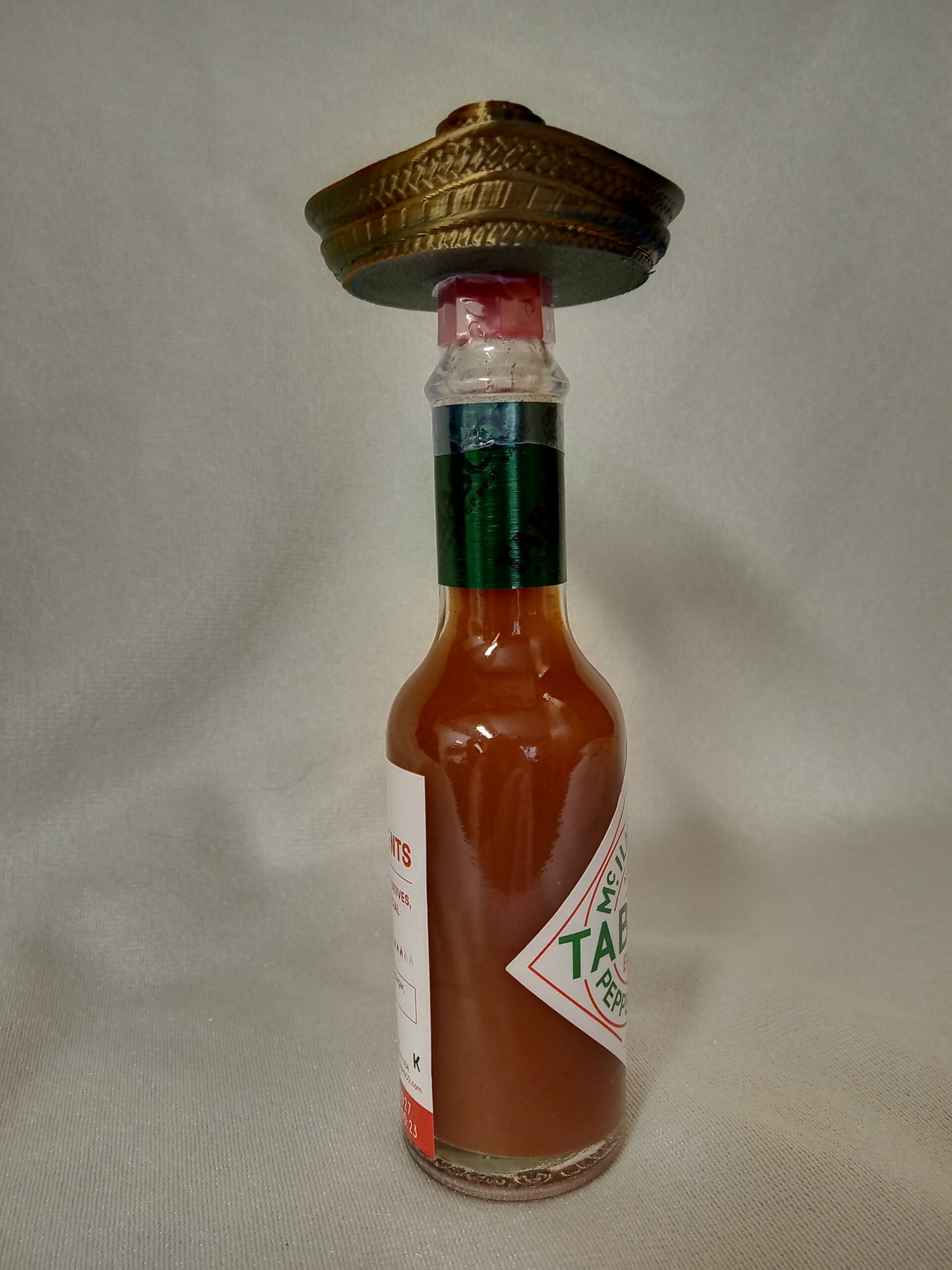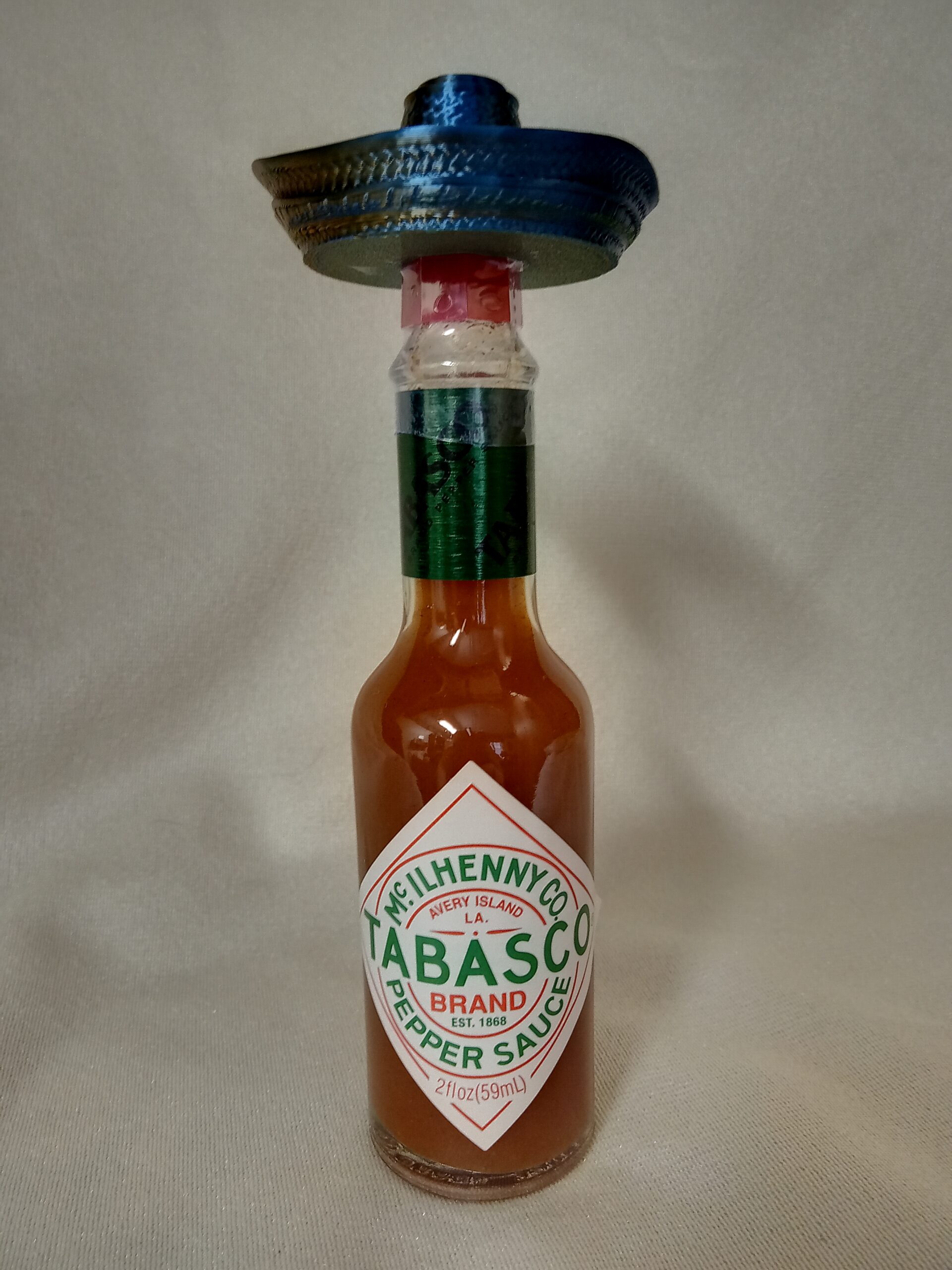 Put a sombrero on your 2 oz tabasco bottle. Printted with a multi color filamaent that changes color as you view it from different amgles.