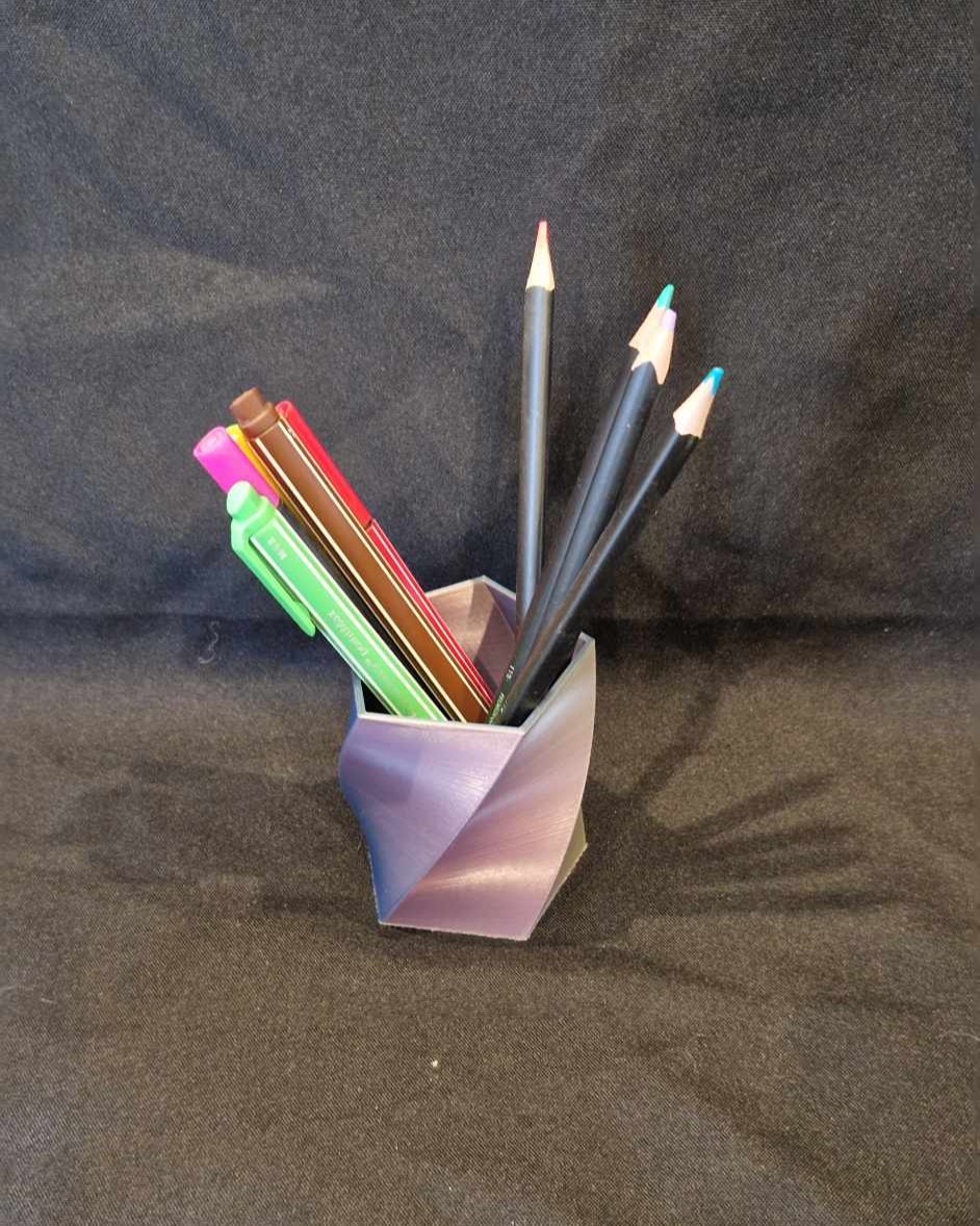 Ce modèle est imprimé avec un filament tricolore qui alterne entre des reflets vert, violet et bleu.