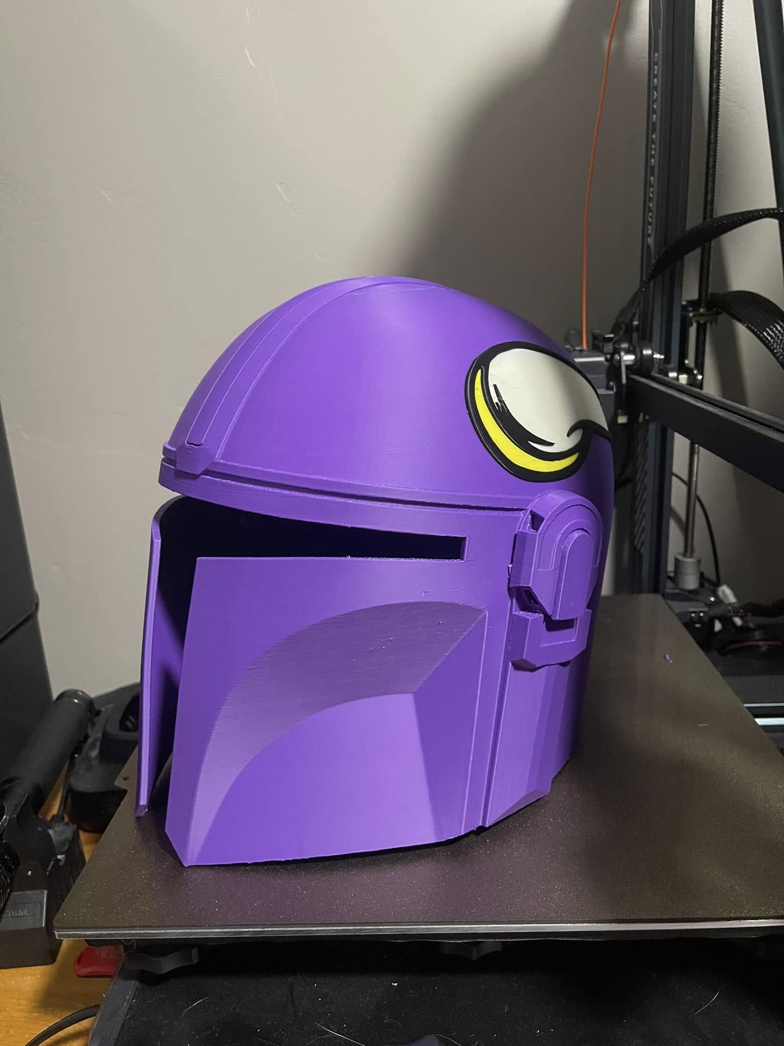 3D printed Mandalorian helmet with horns on both sides. This helmet is sized approximately the same as a medium to large motorcycle helmet. It includes a tinted visor.