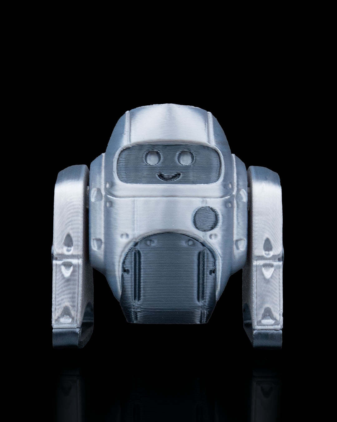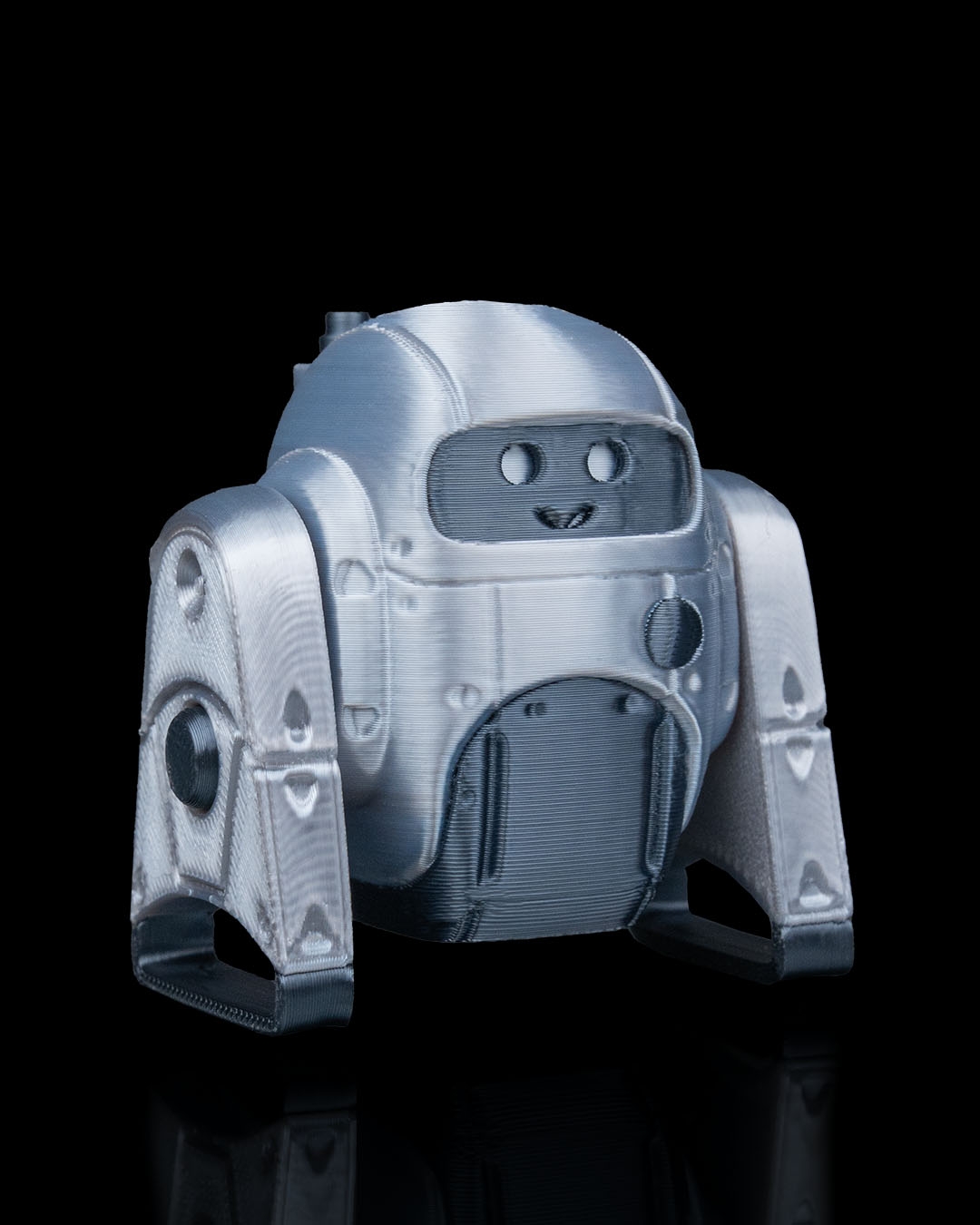 3D printed in durable plastic, the robot shows consistent surface texture and smooth transitions between parts. The visible layer lines complement the mechanical aesthetic and highlight the precision of the print.