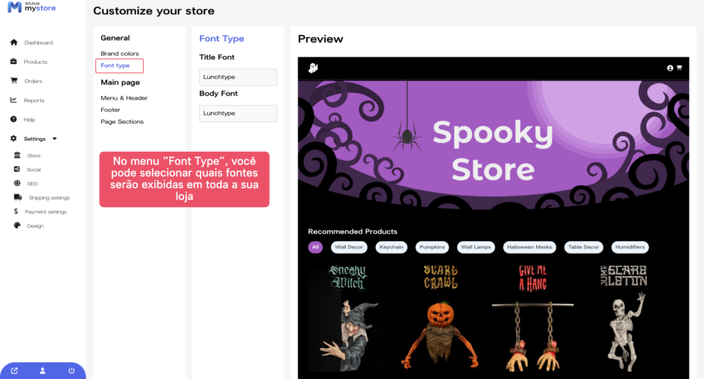 Em seguida, selecione o tipo de fonte da sua loja. Clique na aba “Tipo de fonte” e escolha entre uma variedade de opções de fonte. Você também pode carregar sua própria fonte personalizada.