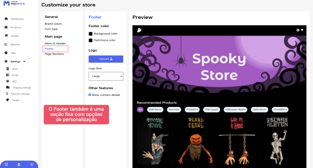 Em seguida, personalize o rodapé da sua loja. Clique na aba “Rodapé” e ajuste as configurações para incluir as informações que você deseja exibir.
