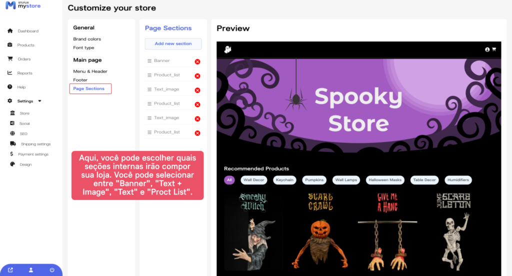 Agora que você personalizou o menu, o cabeçalho e o rodapé da sua loja, você pode adicionar seções de página. Clique na aba “Seções de Página” e selecione as seções que você quer adicionar.