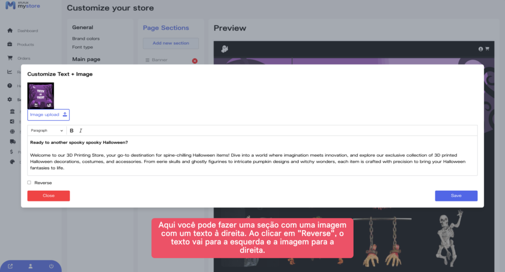 Na aba “Seções de Página”, você pode personalizar a seção de texto e imagem da sua loja. Clique na aba “Texto + Imagem” e adicione o texto e as imagens que você deseja exibir.