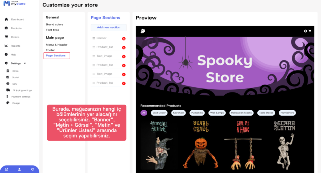 Mağazanızın menüsünü, başlığını ve altbilgisini özelleştirdiğinize göre, şimdi sayfa bölümleri ekleyebilirsiniz. “Sayfa Bölümleri” sekmesine tıklayın ve eklemek istediğiniz bölümleri seçin.